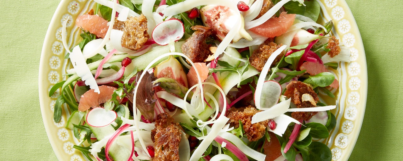 5. Snijd de chioggiabiet, radijsjes en komkommer dun op de mandoline (of in stukjes). Snijd de vijgen en cherrytomaten in vieren. Snijd de grapefruit uit, zodat alleen het vruchtvlees overblijft.