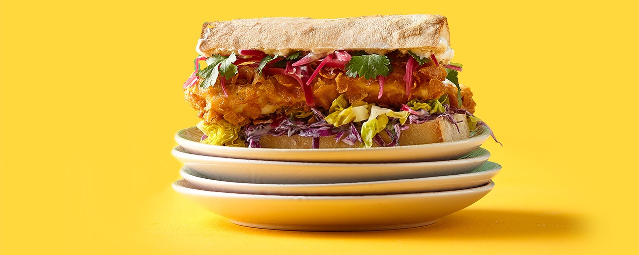 5. Snijd de broodjes open, besmeer ze met de yoghurt-korianderdressing en leg de gesneden little gem erop. Leg de krokante kip erop en maak af met de ingelegde uitjes, rodekoolsalade en wat verse koriander.