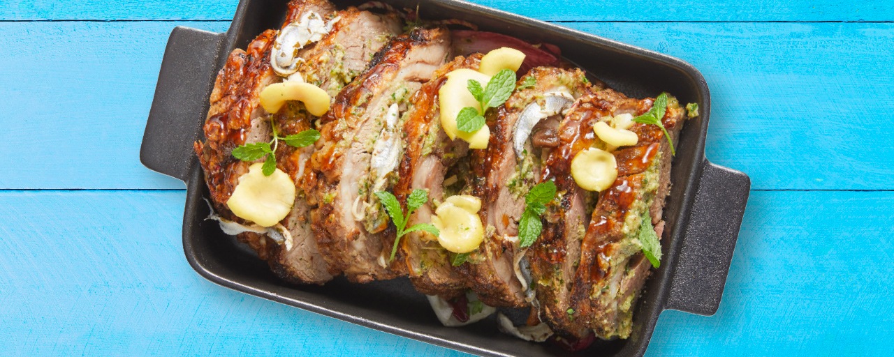 5. Haal wanneer de kerntemperatuur is bereikt de lamsbout van de BBQ en zet de BBQ hoog. Bak de lamsbout vervolgens nog even hard aan. Laat het vlees hierna even rusten en snij in plakken. Serveer met de overgebleven marinade.