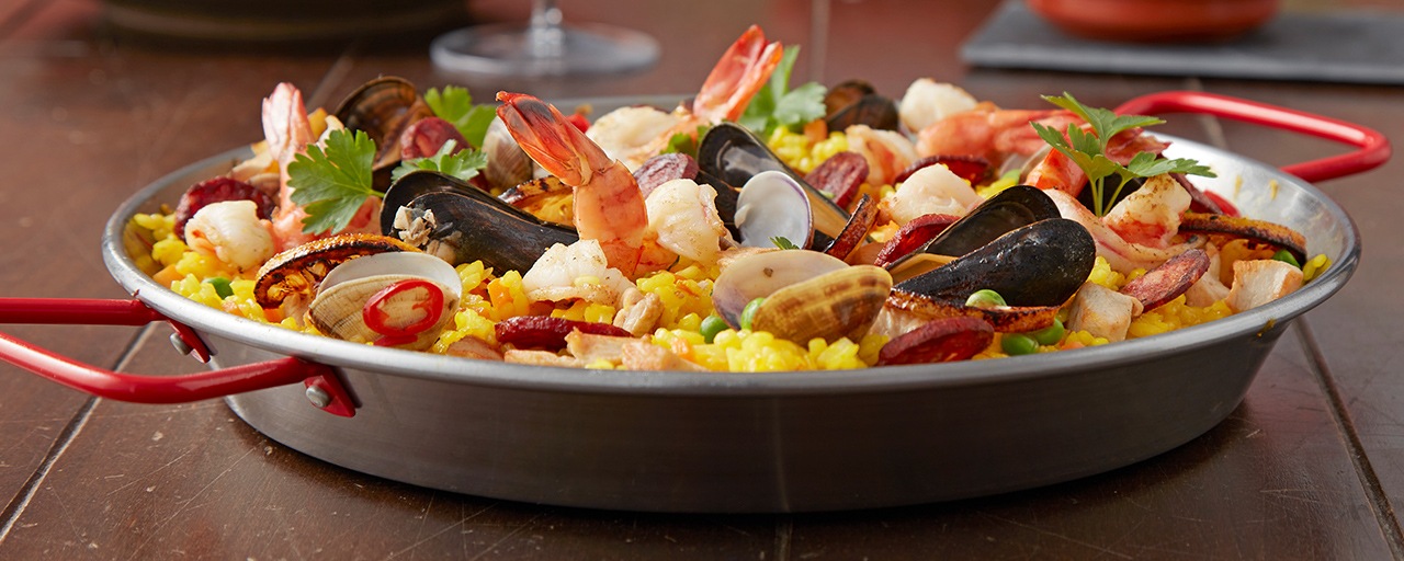 1 . verwarm de paella pan en bak de chorizo uit, zodra je ziet dat de olie vrij is gekomen voeg je de safraan, paprika, rode ui en knoflook toe en bak die even mee.