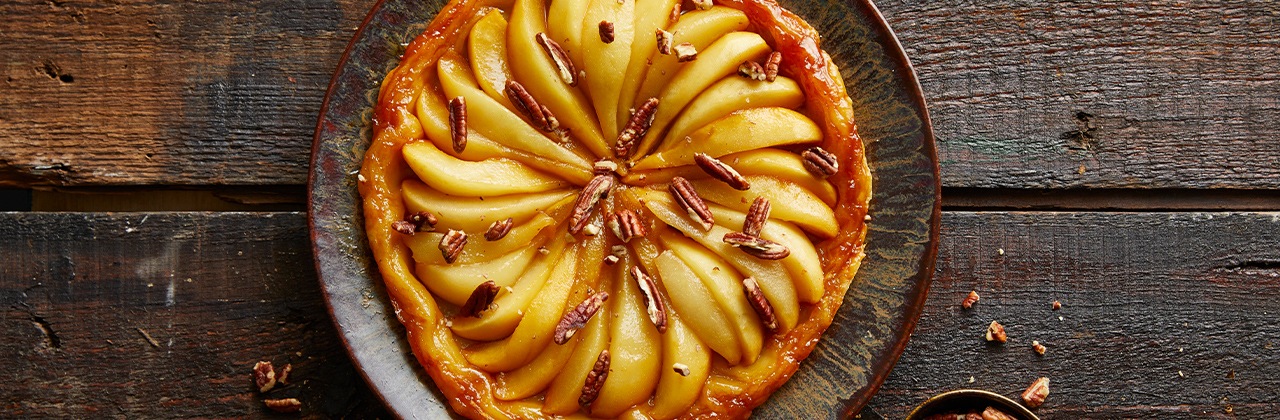 5. Bak in ca. 25 minuten gaar en laat 5 minuten afkoelen alvorens om te draaien op een bord. Verdeel de geroosterde pecannoten over de tarte tatin.