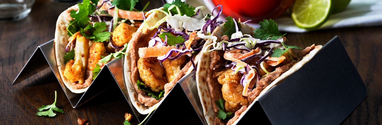 4. Verdeel de gebakken bonen over de tortilla, leg daarop de bloemkoolroosjes en werk af met koolsla. Bestrooi met wat fijngesnipperde koriander.
