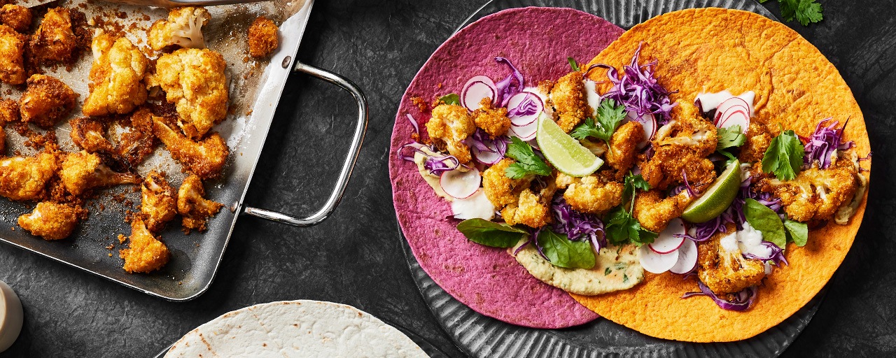 4) smeer een laag guacamole op de tortilla’s, met daar op de salade, rode kool, kikkererwten en rode ui en crispy bloemkool.