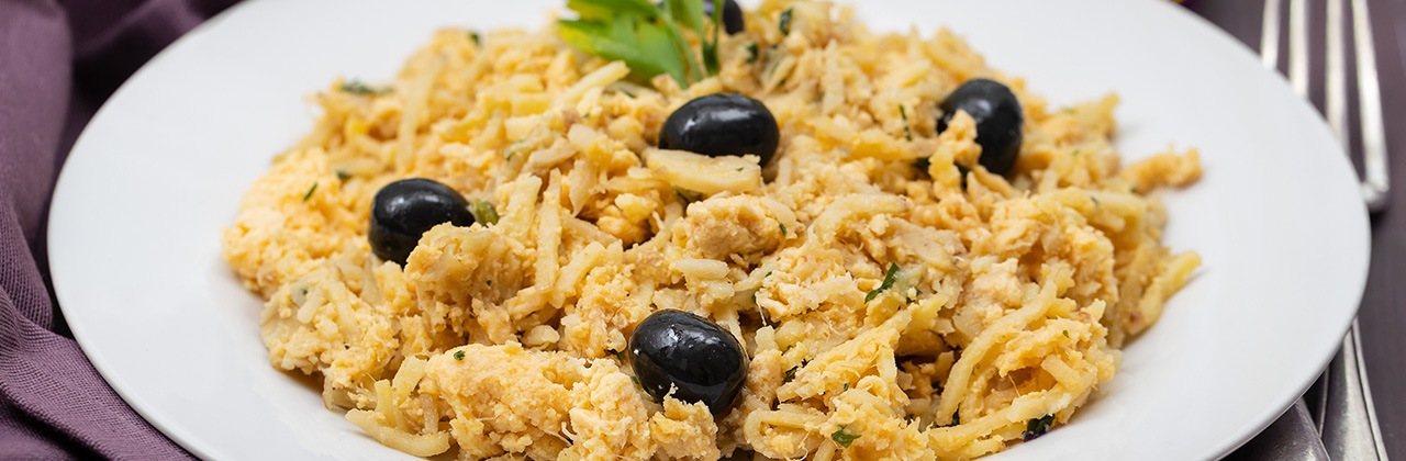5. Proef en breng indien nodig verder op smaak met kruiden. Dien de Bacalhau à Brás bestrooid met de peterselie en olijven op.
