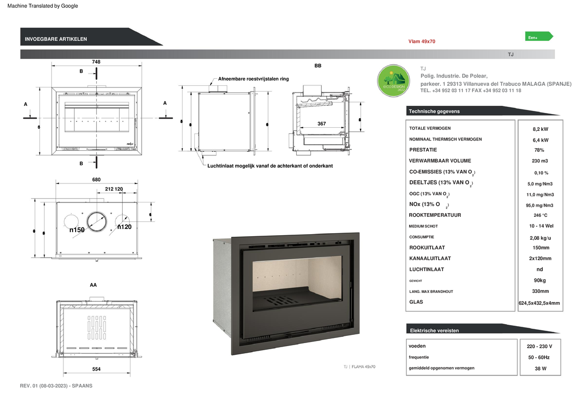 • Insteekbare houtkachel met turbine. Dubbel verbrandingssysteem, ontworpen in overeenstemming met de Europese ECODESIGN 2022-regelgeving, met een totaal verwarmingsvermogen van 8,2 kW en een nominaal vermogen van 6,4 kW. Energieclassificatie A+. Opbrengst: 85,16%